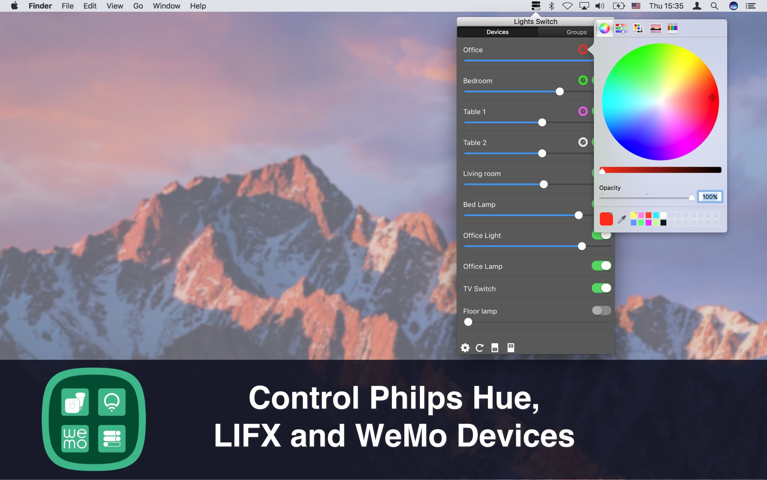 The only Mac app that allows to control Philips Hue, LIFX and WeMo devices.