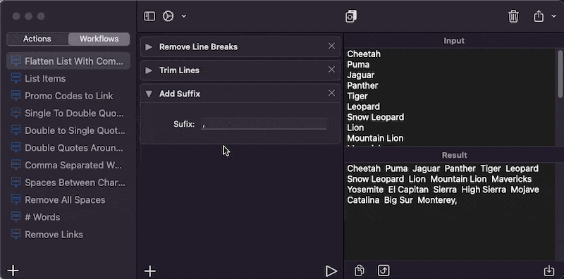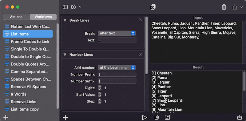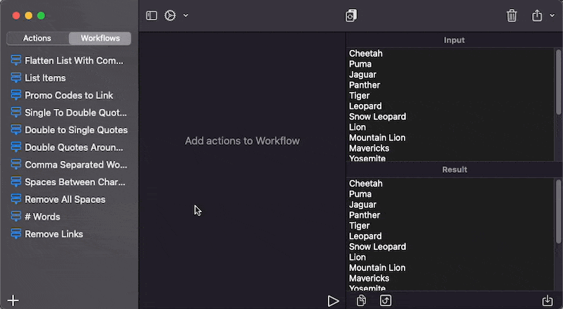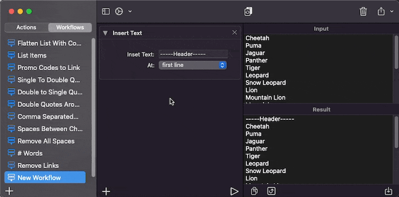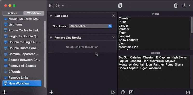 To run the action just select it from the sidebar of the app. Every time you change an action option or the input text, the app will run again the action and will update the result text.