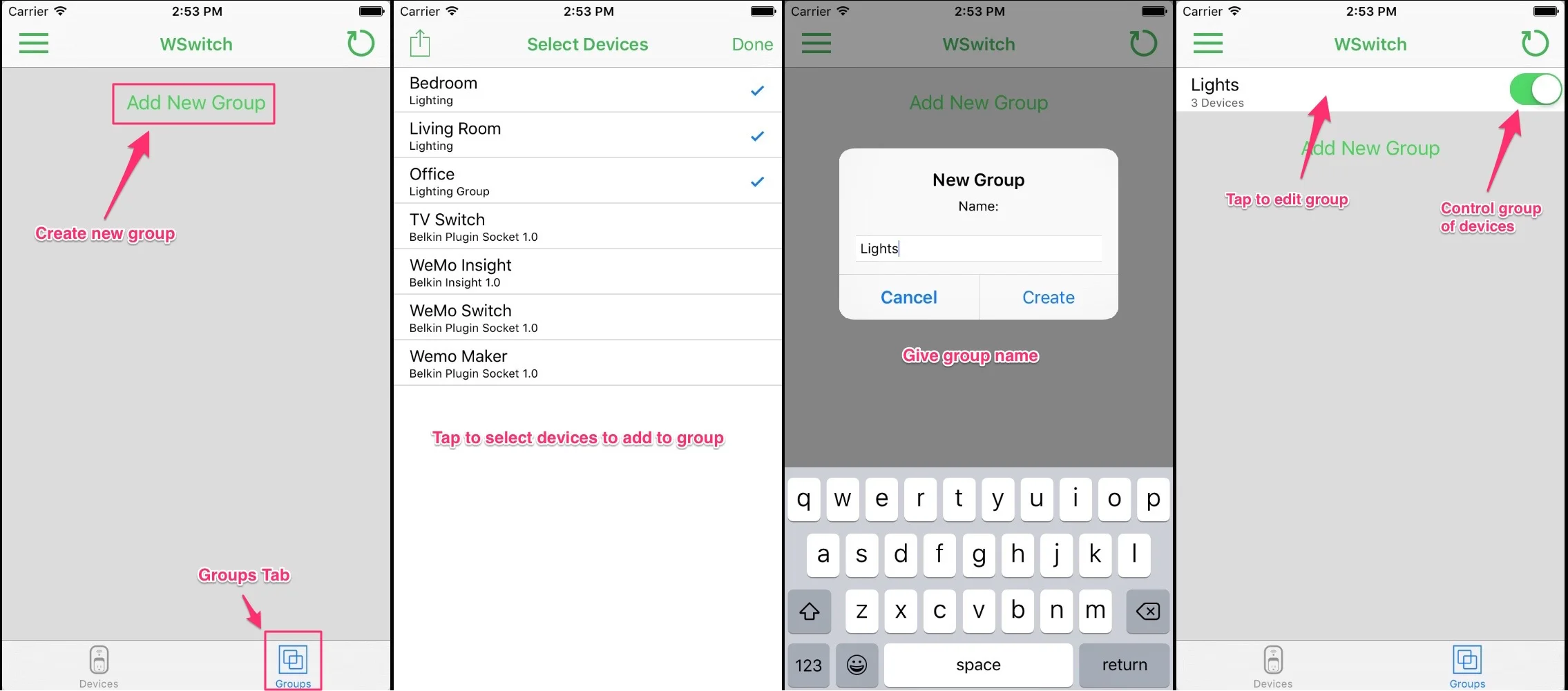 After you have setup the device, just open the WSwitch and from the app menu select the "Refresh Devices" to find all Wemo devices.