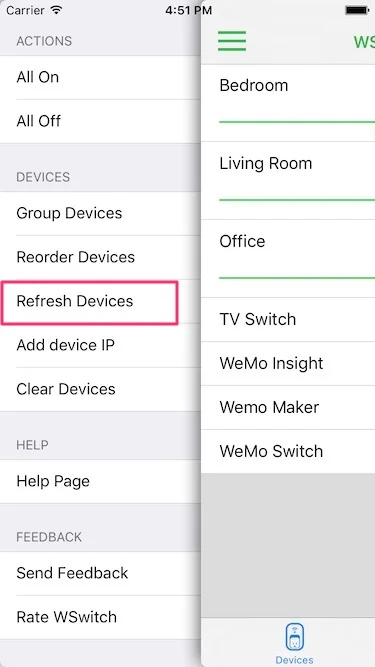 The app will search your local network for Wemo devices automatically on launch. If you want to repeat search manually press the refresh button.